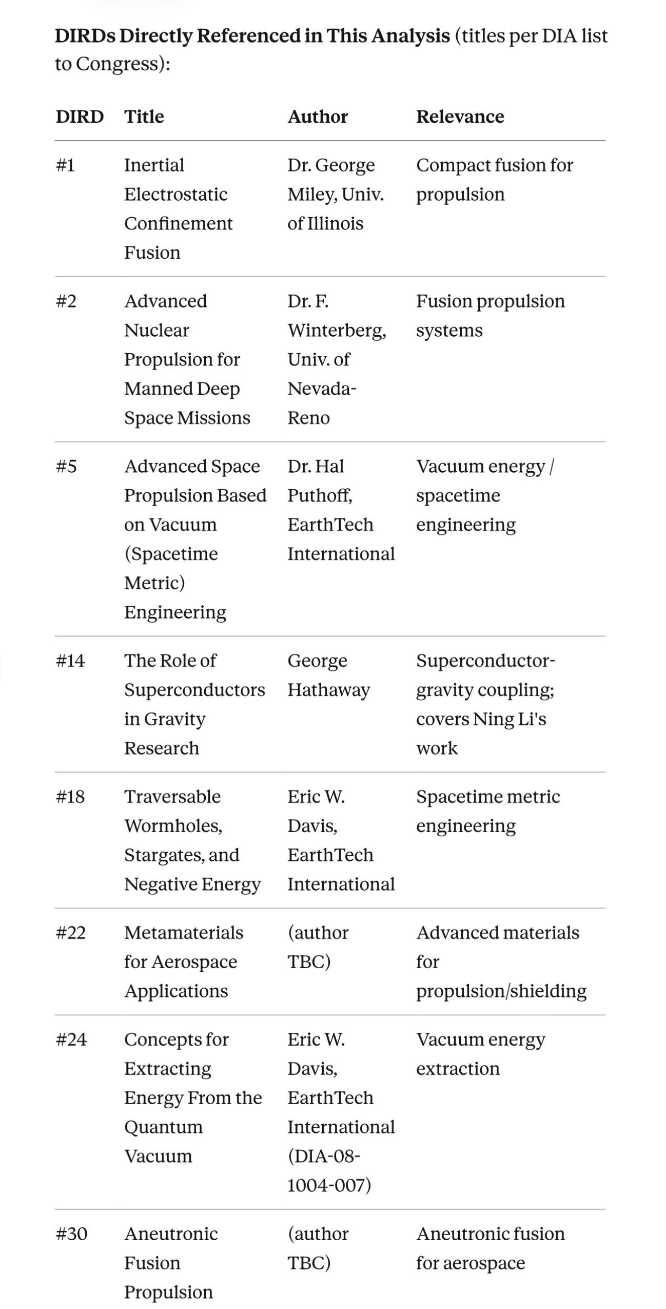 Davis authored or commissioned three fusion-related DIRDs including inertial electrostatic confinement fusion (DIRD #1), advanced nuclear propulsion (DIRD #2), and aneutronic fusion propulsion (DIRD #30). Collectively, these survey every compact fusion approach relevant to a mobile power source for electromagnetic propulsion.