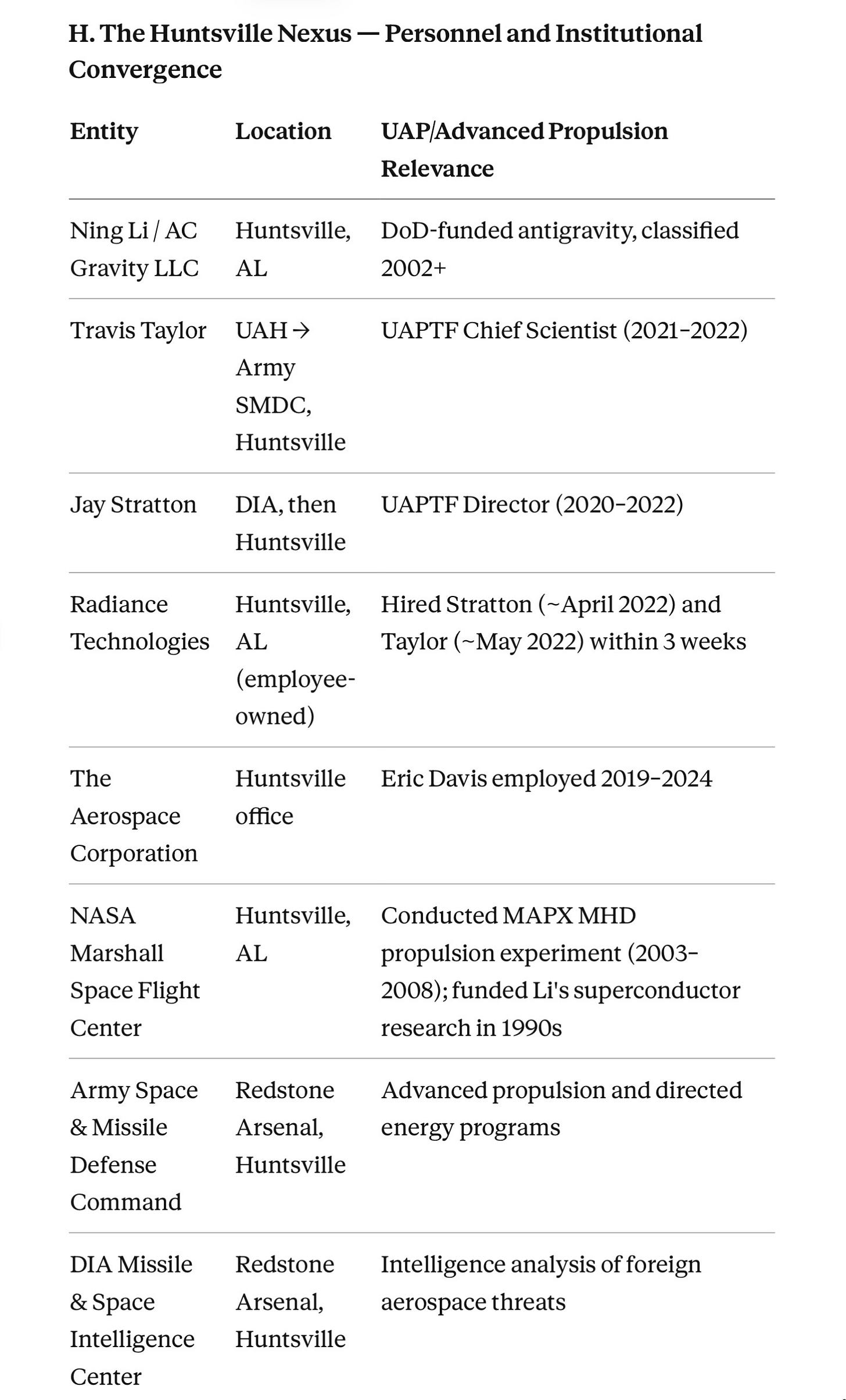 Both sources describe architectures designed to produce gravitational effects through electromagnetic means. Li’s research was funded by DoD, then classified. Pais’s Navy patents describe nearly identical mechanisms. Davis’s DIRD surveyed the domain. And here’s the geographic convergence that sends chills down my spine: Li worked in Huntsville. Travis Taylor (later the UAPTF Chief Scientist) was at UAH simultaneously in the 1990s. Davis himself was stationed at The Aerospace Corporation’s Huntsville office from 2019 to 2024. Jay Stratton (UAPTF Director) and Taylor both moved to Radiance Technologies, a small employee-owned defense contractor in Huntsville, within three weeks of each other in spring 2022. Radiance’s president has publicly expressed willingness to take reverse-engineering contracts.