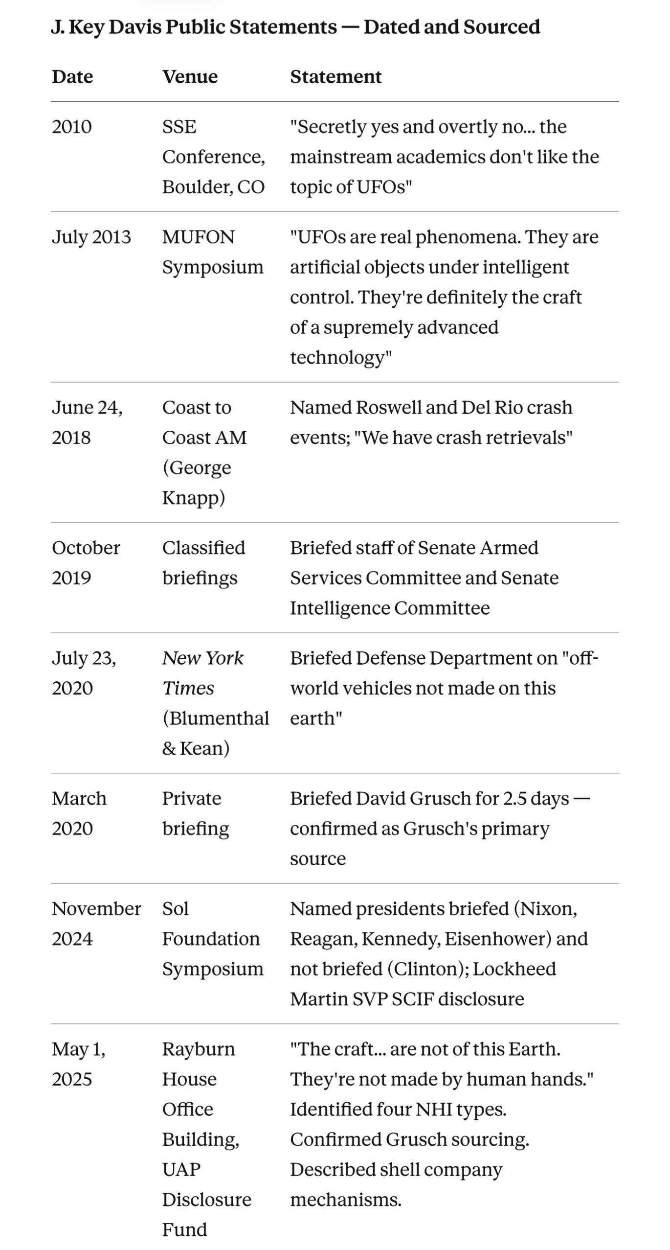 Phase III (2020): “Off-world.” The New York Times, July 23, 2020: Davis said “he gave a classified briefing to a Defense Department agency as recently as March about retrievals from ‘off-world vehicles not made on this earth.’” He added: “We couldn’t make it ourselves.” First time an official of his caliber used explicitly non-human language in a paper of record. The goalpost moved from “unidentified” to “identified as not from here.”